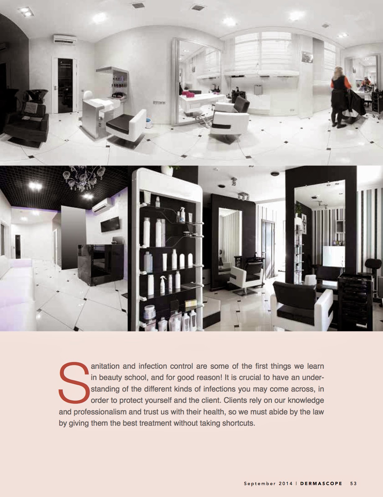 Sanitation and infection-control are some of the first things we all learn in beauty school, and for a good reason! It is crucial to have an understanding of the different kinds of infections you may come across, in order to protect yourself and the client. Clients rely on our knowledge and professionalism, and trust us with their health, so we must abide the law, and give them the best treatment without taking any shortcuts. In this article of mine which was recently published in DERMASCOPE Magazine, I share my knowledge and experience regarding sanitation and disinfection in the spa/salon workplace! Click on this link to download the full PDF off www.saian.net